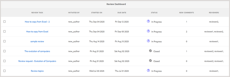 レビューダッシュボードには、タスク名、レビューを開始したユーザー、レビューが開始された日付、期限、ステータス、作成者が承認または却下していない新しいコメントの数、レビュー担当者の名前など、レビュータスクに関する詳細が表示されます。 タスクは、古いタスクに対して新しく作成されたタスクの順序で一覧表示されます。