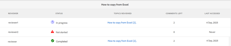 1 つまたは複数のトピックのレビューからレビュータスクが複製された場合、それらのトピックのみがレビュータスクリストに表示されます。 これらのトピックを、異なるレビュアーのセットでレビュー用に共有できます。