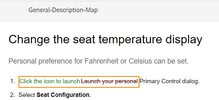 プレビューモードでトピックを開くと、すべての変更を適用した後に作成者が表示したトピックの表示方法が表示されます。 例えば、挿入されたテキストはすべて通常のテキストとして表示され、\(deleted\) テキストから取り除かれたものはすべてコンテンツから削除されます。