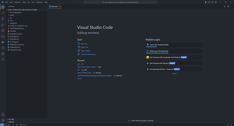 次のコマンドをリストに表示された順序で使用して、react-starter-kit-aem-headless-forms ディレクトリに移動し、Visual Studio Code を開きます。