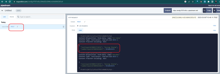「リクエスト bin」タブで、送信されたデータを確認します。