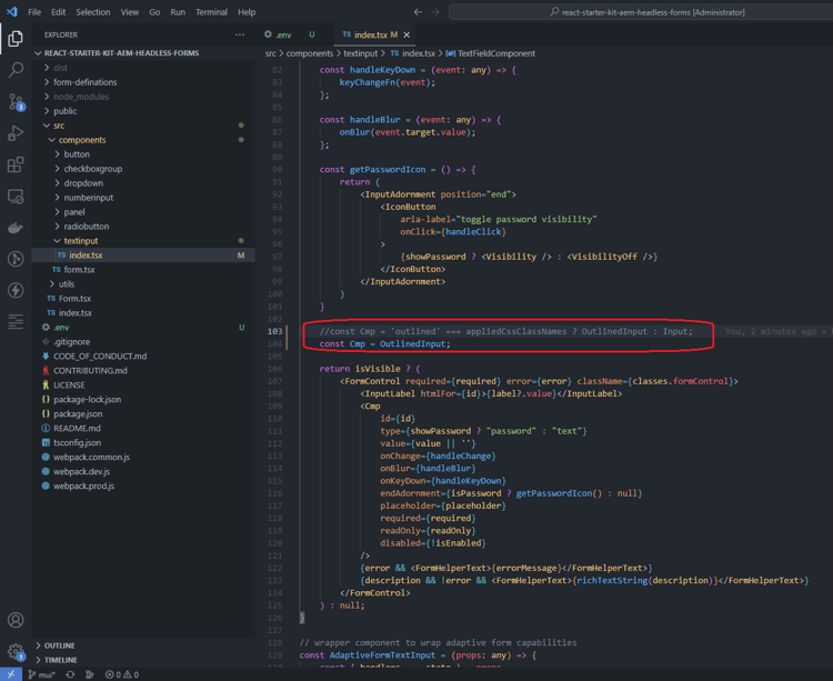 //を追加します。行がコメントに変換されます。code language-shell //const Cmp = \'outlined\' === appliedCssClassNames ? OutlinedInput: Input; -