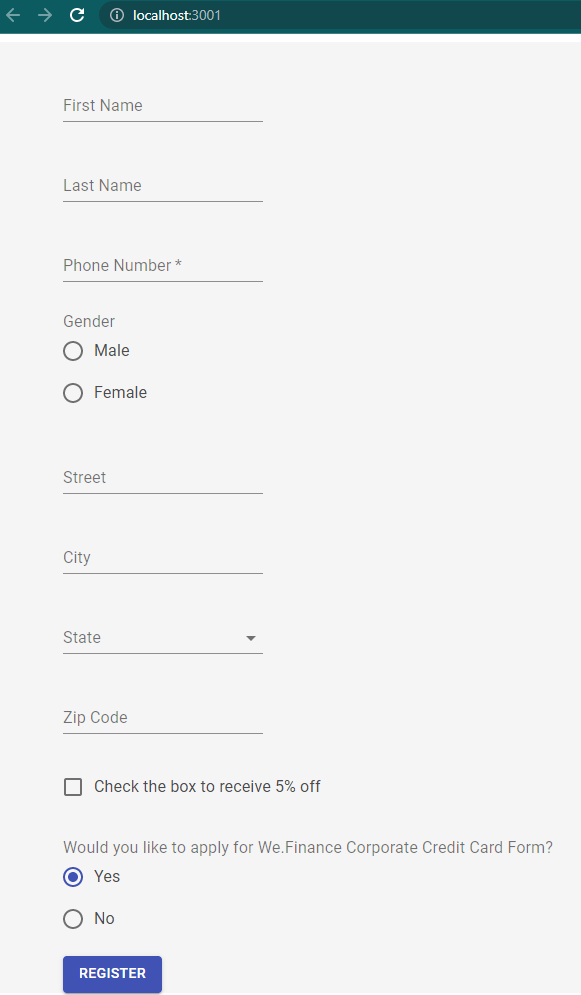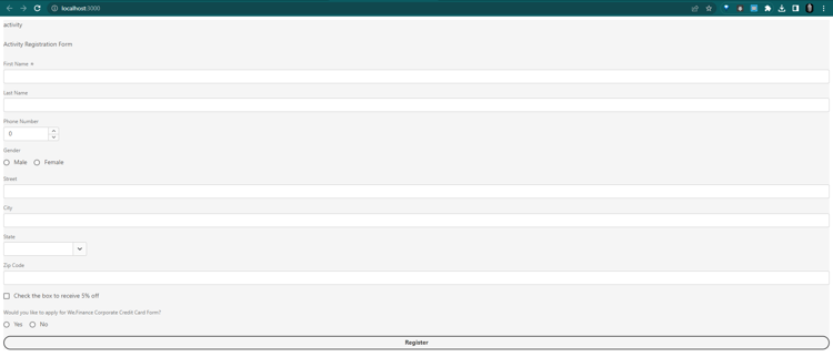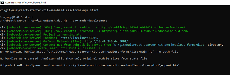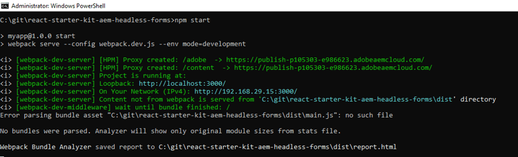 上記のコマンドは、React スペクトルフロントエンドライブラリを使用して AEM から取得したフォーム定義をヘッドレス方式でレンダリングするローカル開発サーバーを起動します。