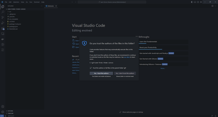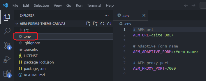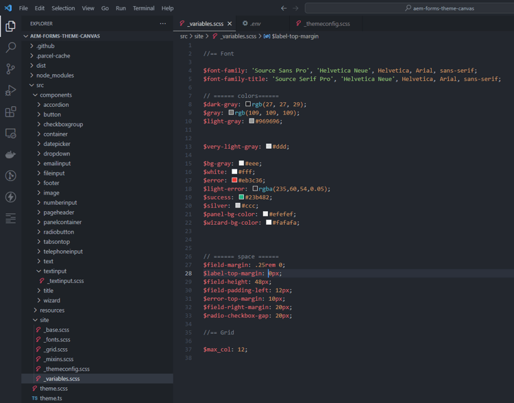 次のコマンドをリストに表示された順序で使用して、aem-forms-theme-canvas ディレクトリに移動し、Visual Studio Code を開きます。