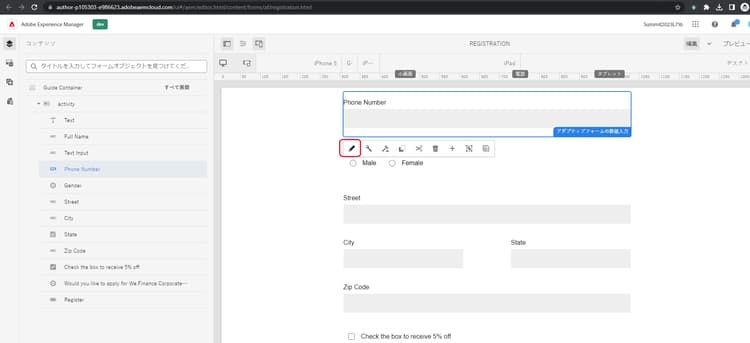 「電話番号」フィールドを選択し、ツールバーの 編集アイコン(鉛筆アイコン) をクリックします。ポップアップツールバーが表示されない場合は、編集モードに切り替えます。 右上の「編集」ボタンをクリックし、左にある「プレビュー」ボタンをクリックします。