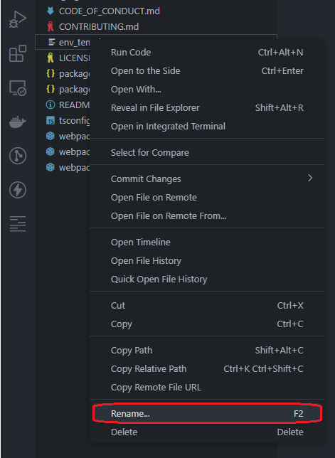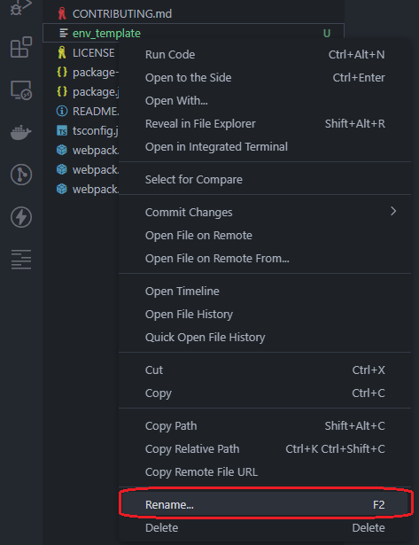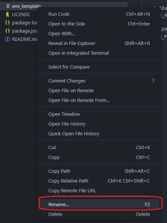 env_template ファイルを.env ファイルに名前変更します。名前を変更するには、env_template ファイルを右クリックし、「名前を変更」オプションを選択します。