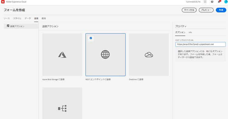 「送信」タブをクリックし、「REST エンドポイントに送信」カードを選択し、「POST リクエストの URL」フィールドで公開 bin を指定します(下図を参照)。
