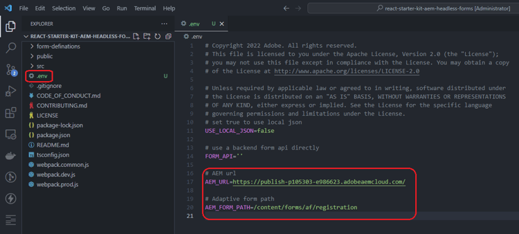 次のコマンドをリストに表示された順序で使用して、react-starter-kit-aem-headless-forms フォルダーに移動し、Visual Studio Code でコードを開きます。