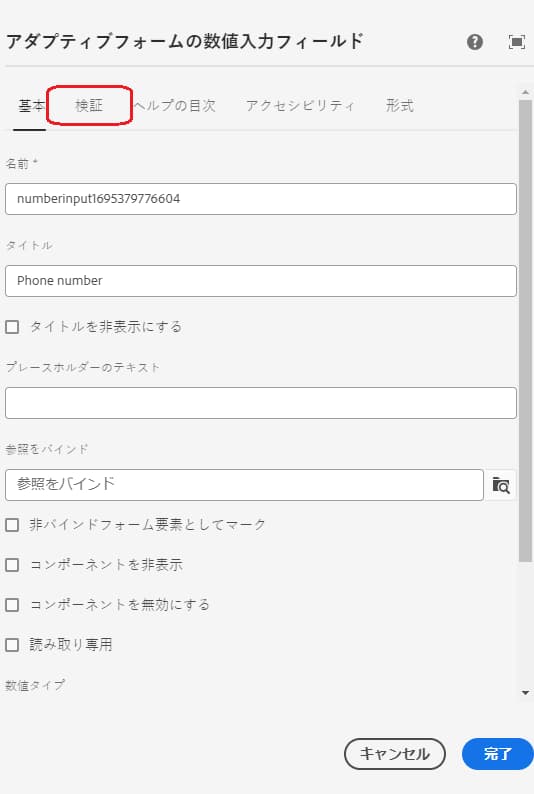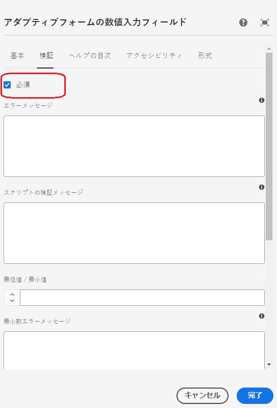 「検証」タブ を開き、フィールドに 必須 とマークを付け、「完了」をクリックします。成功メッセージが表示されます。