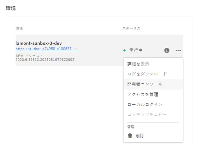 Cloud Manager で開発者トークンを取得できます。Adobe Cloud Manager にログインします。Experience Manager/Cloud Manager をクリックします。適切なプログラムを選択し、環境の横にある省略記号をクリックします。