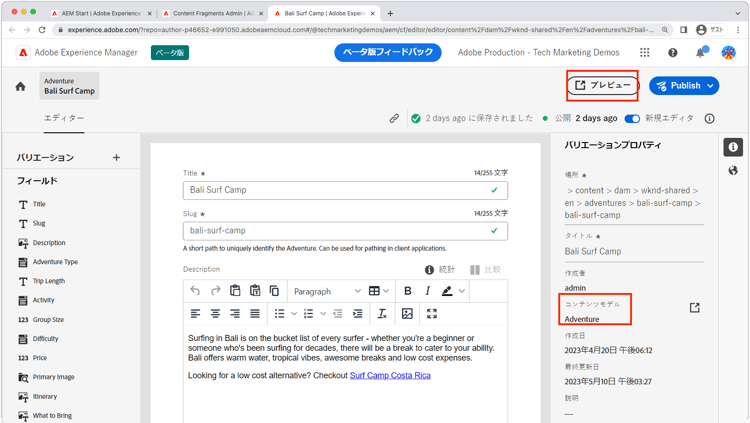 ${contentFragment.path}/content/dam/wknd-shared/en/adventures/surf-camp-bali/surf-camp-bali${contentFragment.id}12c34567-8901-2aa3-45b6-d7890aa1c23c${contentFragment.variation}main${contentFragment.model.path}/conf/wknd-shared/settings/dam/cfm/models/adventure${contentFragment.model.name}adventureプレビュー URL の例: