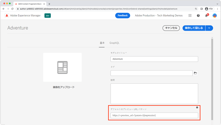 - URL 式を使用して、コンテンツフラグメントモデルのプレビュー URL を入力します。