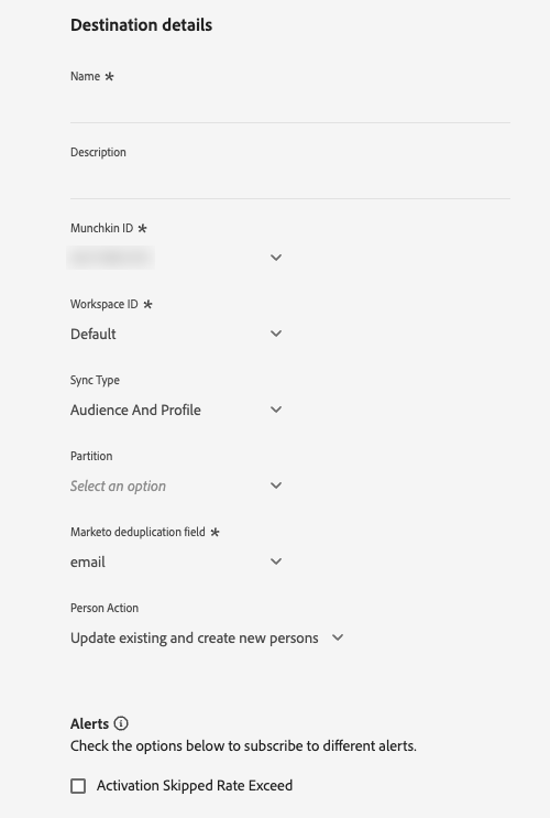 Partition: パーティションの選択は、Profile onlyまたは Audience and profile 同期タイプを選択する場合にのみ使用できます。 選択したワークスペースに関連付けられているMarketo パーティション ID を選択します。 これにより、書き出されたデータを受け取るMarketoのリードパーティションを指定できます。 特定のパーティションを選択しない場合、データはMarketoの Default パーティションに送信されます。