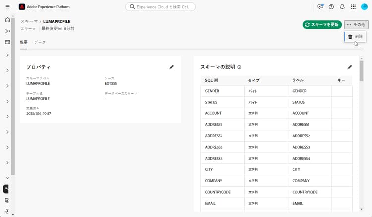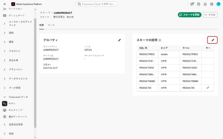 連合データベース内のテーブルは、更新、追加、削除できます。その場合、最新の変更内容に合わせて Adobe Experience Platform のスキーマを更新する必要があります。これを実行するには、スキーマ名の横にある