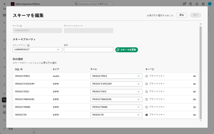 選択した各テーブルでは、選択した列を含むスキーマが生成されます。各テーブルでは、スキーマのラベルの変更、説明の追加、フィールドラベルの名前の変更、フィールドラベルの表示の設定、スキーマのプライマリキーの選択ができます。