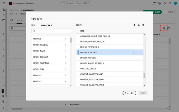 データ表示を変更するには、「列を設定」ボタンをクリックします。