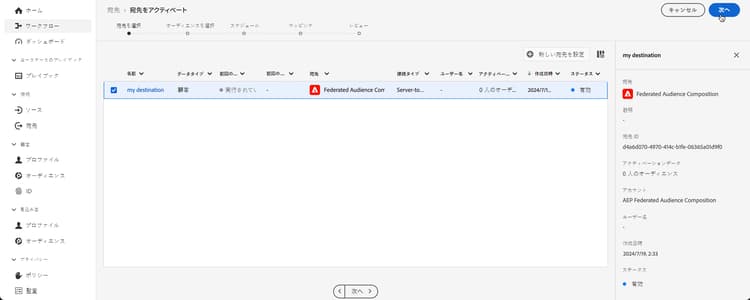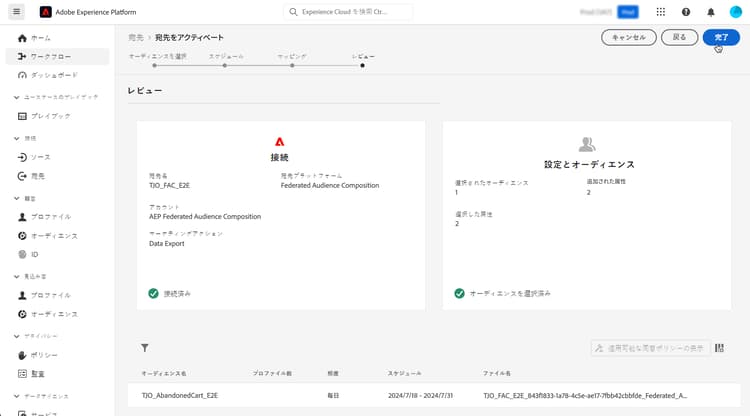 Adobe Experience Platform オーディエンスを連合オーディエンス構成に送信する主な手順を以下に示します。