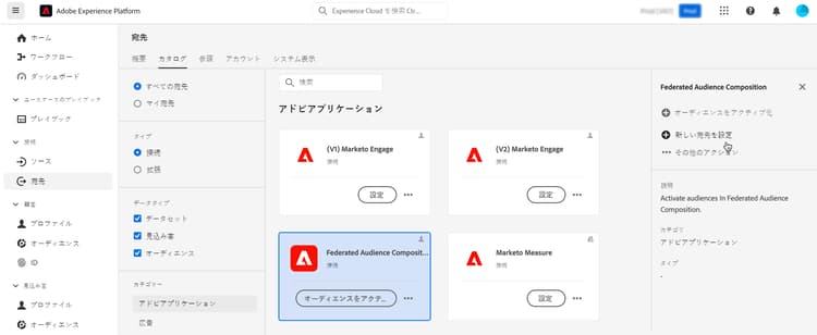 Adobe Experience Platform 宛先カタログにアクセスし、連合オーディエンス構成宛先を選択します。