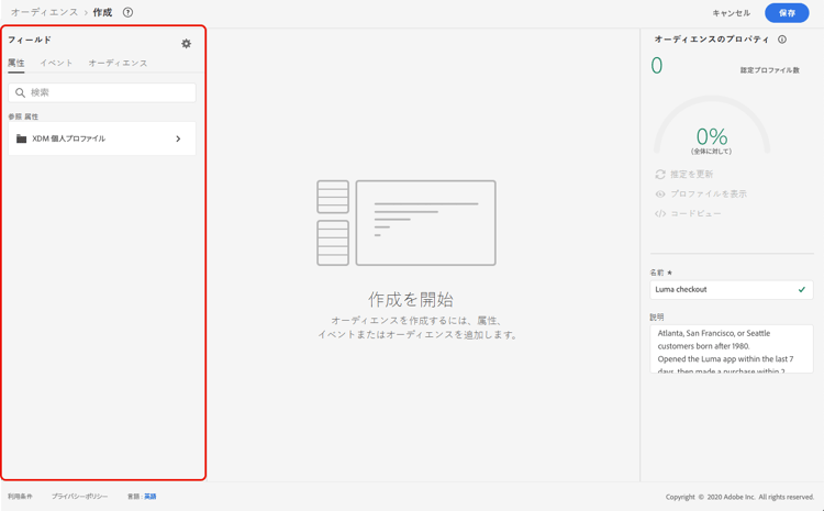 note note NOTE 左側のペインに表示されるフィールドは、組織での XDM 個人プロファイルと XDM ExperienceEvent スキーマの設定方法によって異なります。詳しくは、Adobe Experience Data Model(XDM)ドキュメントを参照してください。