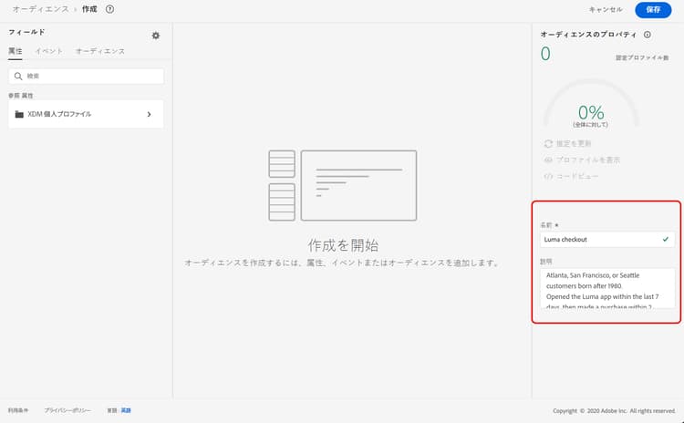 オーディエンスのプロパティパネルで、オーディエンスの名前と説明(オプション)を入力します。
