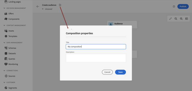 構成の準備が整ったら、「公開」ボタンをクリックして、コンポジションを公開し、結果のオーディエンスを Adobe Experience Platform に保存します。