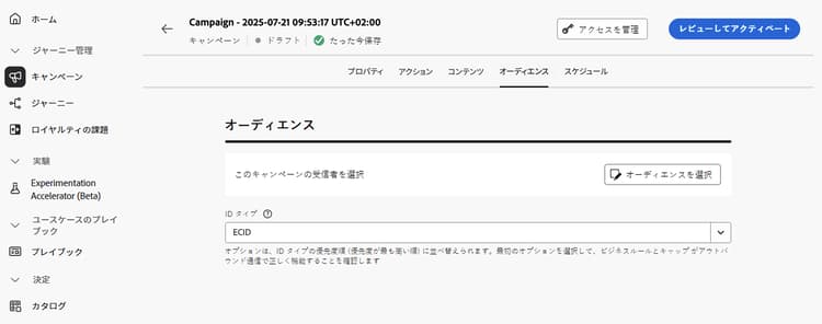 1 つのキャンペーンで使用できる ID タイプは 1 つだけです。様々な ID の中から選択した ID タイプを持たないセグメントに属する個人は、キャンペーンのターゲットにすることができません。ID タイプと名前空間について詳しくは、Adobe Experience Platform ドキュメントを参照してください。
