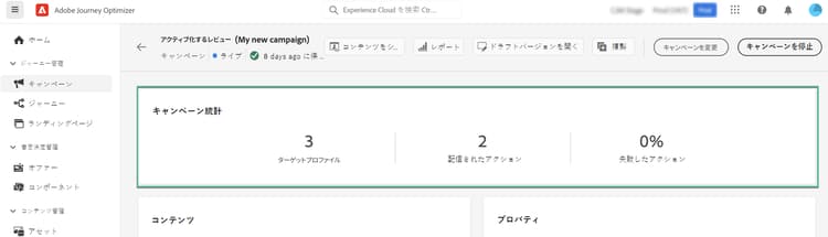 キャンペーンがアクティブ化されると、キャンペーンを開いて、いつでもその情報を確認できます。概要では、ターゲットプロファイルの数と、配信されたアクションおよび失敗したアクションの数に関する統計情報を取得できます。