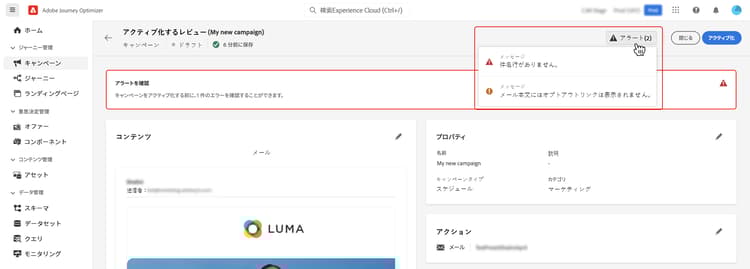 エラーが発生した場合は、キャンペーンをアクティブ化できません。続行する前にエラーを解決します。