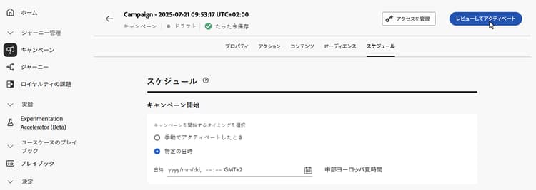 キャンペーンの設定画面で、「アクティブ化するレビュー」をクリックして、キャンペーンの概要を表示します。