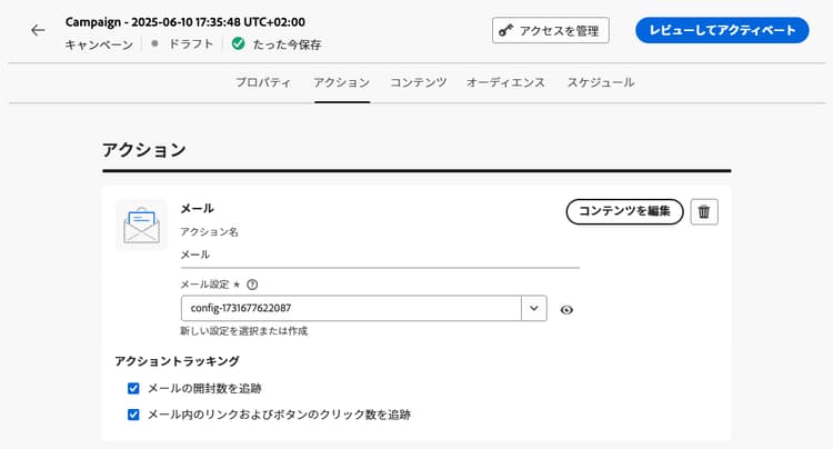 「アクション」タブを使用すると、メッセージのチャネル設定を選択し、トラッキング、コンテンツ実験、多言語コンテンツなどの追加設定を指定できます。