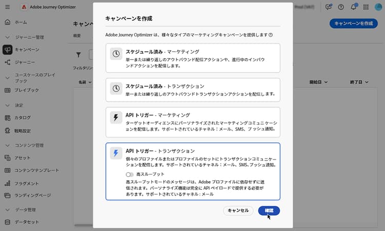 API トリガー - マーケティング - ターゲットオーディエンスにパーソナライズされたマーケティングコミュニケーションを送信するには、この API トリガーキャンペーンのタイプを選択します。