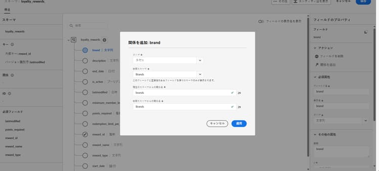 続けて、ロイヤルティ報酬スキーマと ブランドスキーマ の関係を作成し、各報酬エントリを適切なブランドに関連付けます。