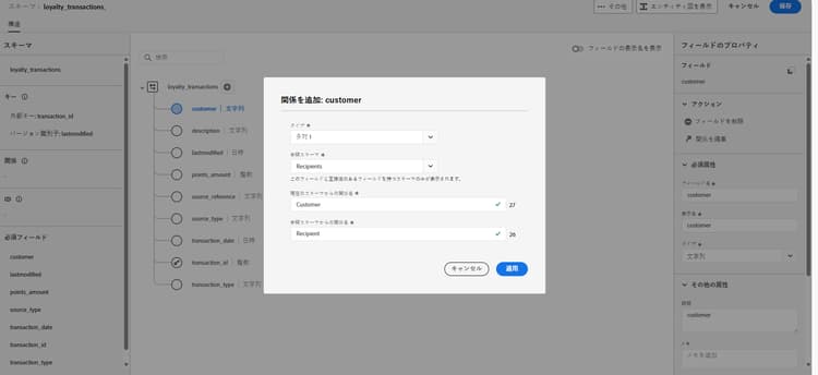 ロイヤルティトランザクションスキーマと 受信者 スキーマ間の関係を確立して、各トランザクションを正しい顧客レコードに関連付けます。