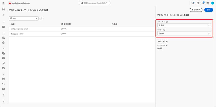 Recipientという名前のスキーマが使用されますが、Visitors、Customersなどの代替スキーマを設定することもできます。note important IMPORTANT ターゲットスキーマは、 Profileスキーマと 1:1 の関係を持つ必要があります。例えば、Purchasesは通常一対多の関係を表すので、ターゲットスキーマとして使用できません。 -