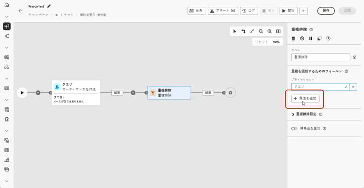 「重複を識別するためのフィールド」セクションで、「属性を追加」ボタンをクリックして、メールアドレス、名、姓など、同一の値によって重複を識別できるフィールドを指定します。 フィールドの順序によって、最初に処理するフィールドを指定できます。
