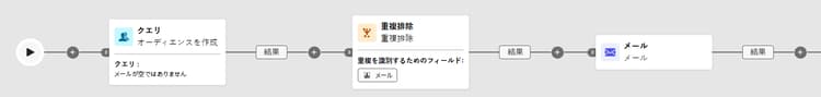 次の例では、配信を送信する前に、重複排除 - 重複 アクティビティを使用して、ターゲットオーディエンスから重複レコードを削除します。まず、オーディエンスは、空でない「メール」フィールドを持つプロファイルのみを含むようにフィルタリングされます。次に、重複排除 - 重複 アクティビティは、メールアドレスを使用して重複を識別および除外します。
