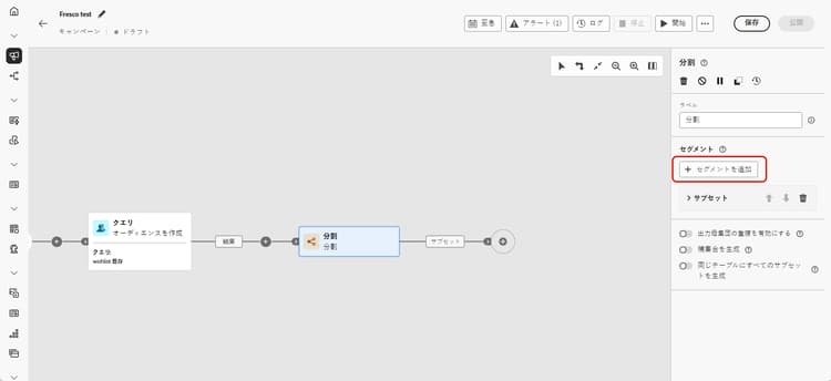 アクティビティ設定パネルが開き、デフォルトのサブセットが表示されます。「セグメントを追加」ボタンをクリックして、入力母集団をセグメント化する必要な数のサブセットを追加します。
