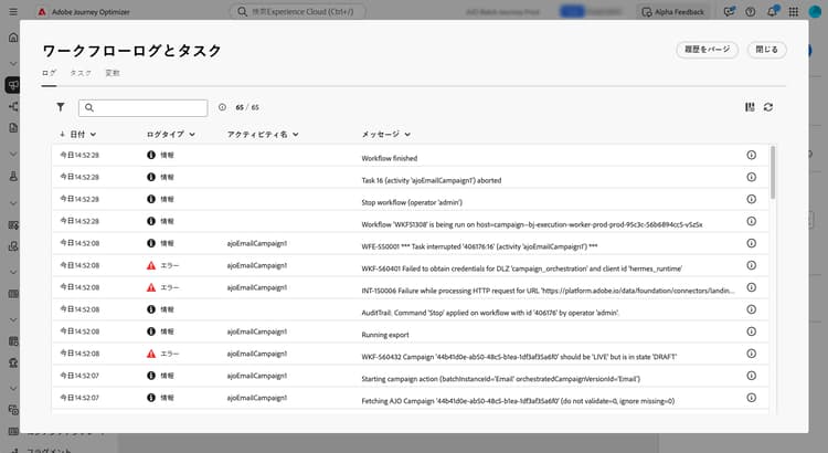ログとタスク 画面には、キャンペーンの実行の完全な履歴が表示され、すべてのユーザーのアクションと発生したエラーが記録されます。