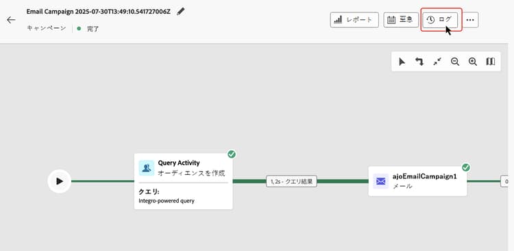 ログとタスクの監視は、調整されたキャンペーンを分析し、正しく実行されていることを確認する重要な手順です。ログとタスクには、キャンバスツールバーのテストモードとライブモードの両方で使用できる「ログ」ボタンからアクセスできます。