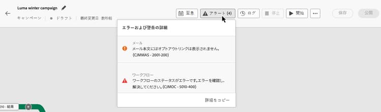 キャンバスツールバーにある アラート/警告 アイコンは、実行前にプロアクティブに表示される警告や、実行中または実行後に発生するエラーなどの問題を通知します。