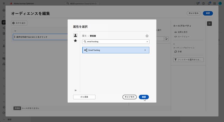 ルールビルダーで「条件を追加」をクリックし、属性ピッカーから「メールトラッキング」を選択します。
