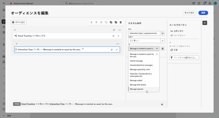 カスタム条件オプションから、演算子として 次の値に含まれる を使用し、ユースケース(例:メッセージが開封されたまたはメッセージリンクがクリックされた)に応じて 1 つ以上の値を選択します。