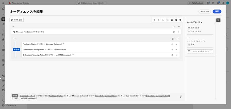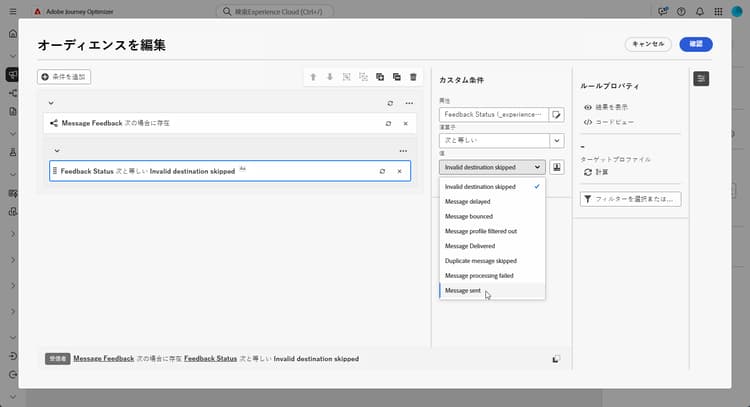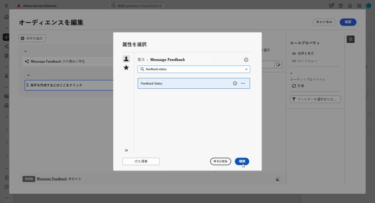 ルールビルダーで「条件を追加」をクリックし、属性ピッカーから「メッセージフィードバック」を選択します。「確認」をクリックして、メッセージフィードバックが存在するなどの条件を作成します。