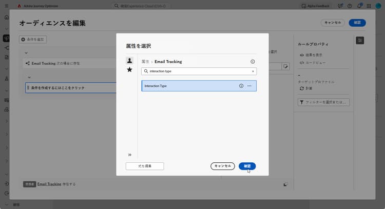 受信者のメッセージとのインタラクションをターゲットにするには、メールトラッキング属性にリンクされた別の条件を追加し、インタラクションタイプ属性を検索します。