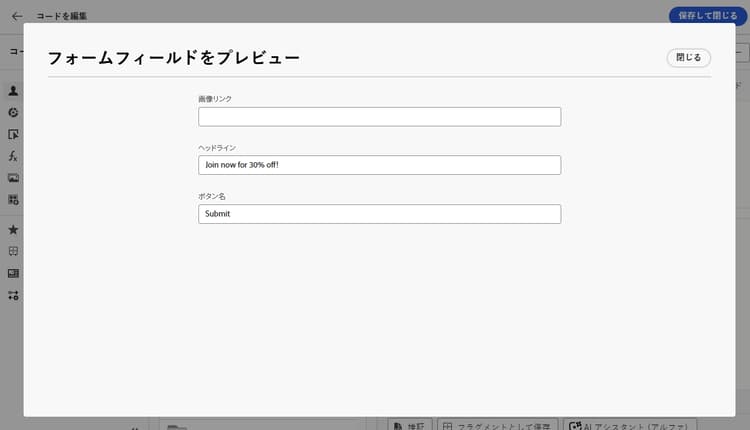 パーソナライゼーションエディターを開くことなく、コードベースのエクスペリエンスジャーニーまたはキャンペーンからフォームフィールドを簡単に編集できます。