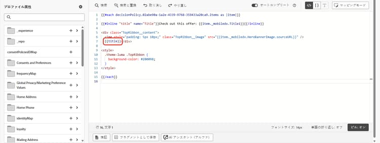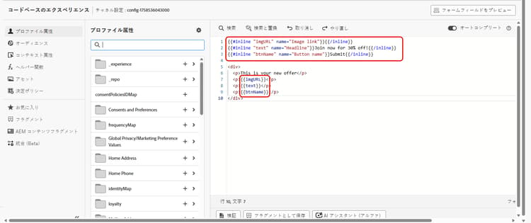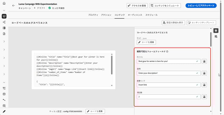 コードベースのエクスペリエンスを作成する際、技術者以外のマーケターは、パーソナライゼーションエディターを開いたり、ジャーニーやキャンペーンの他のコード要素に触れたりする必要なく、インターフェイスでこれらのフィールドを直接編集できます。