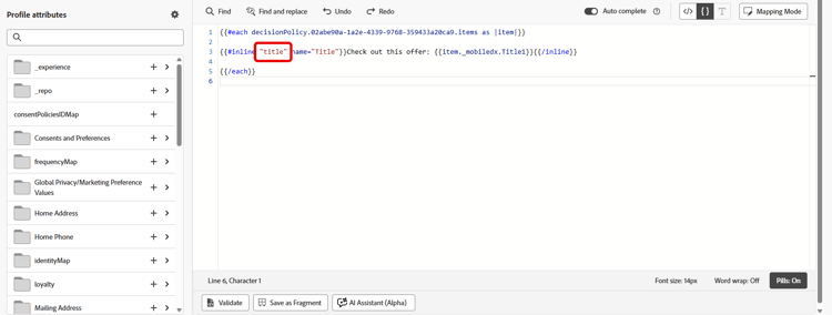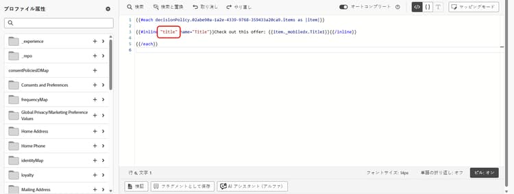コンテンツテンプレートに決定ポリシーを追加した場合、オファーカタログスキーマで使用可能なすべての属性が付属します。決定項目は、インラインで、または式エディターを使用して編集できます。