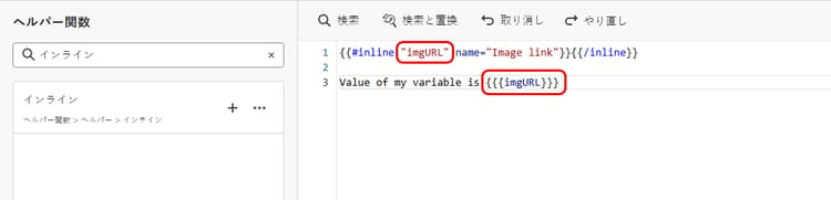 編集可能なフォームフィールドを定義するには、左側のナビゲーションパネルの ヘルパー関数 メニューに移動し、インライン属性を追加します。変数を宣言し呼び出す構文は、コンテンツに自動的に追加されます。