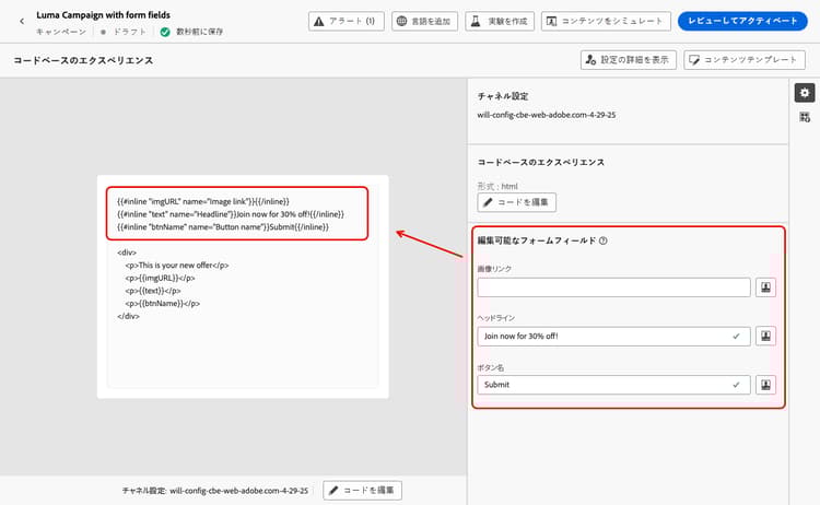 ➡️ コードベースのエクスペリエンステンプレートに編集可能なフィールドを追加する方法について詳しくは、このビデオをご覧ください