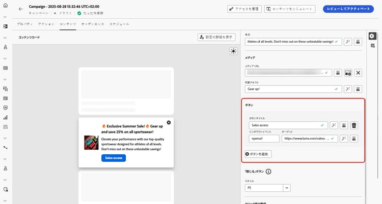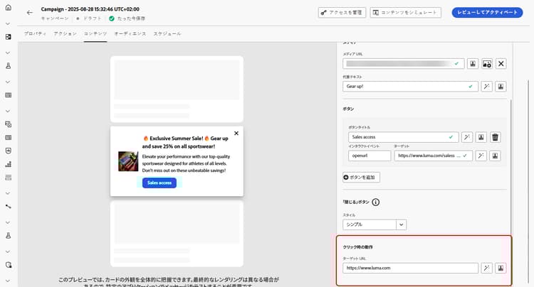 「ターゲット」フィールドに、ユーザーがボタンを操作した後に遷移する web URL またはディープリンクを入力します。